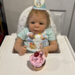 Gotz Early Reborn “Knufflechen” Hildegard Gunzel, in soft vinyl. She is quite big at 22 inches legs bent. She has a 3/4 cloth body but has a neck and chest plate so her head is ball jointed. Has one spot on her wrist. I do not have a date, but the body has an edition number and “2007”. She will come in the hand sewn outfit shown (Dress and bloomers).