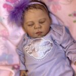 Super Cute Artist Proof “Eleanor Anne” in cloth body silicone. She is poured in Eco 30 Silicone. Early style “reborn painting”. Eleanor has 3/4 arms and full legs on a signed cloth body. Her paint is in great condition. Dark brown glass eyes with painted eyebrows. Black mohair rooted “peculiarly in an upwards direction”, and goes nicely into tiny ponytails. Eleanor has a handmade bracelet that Suzon made for her. Signed by Laura Tuzio-Ross and comes with her original COA.