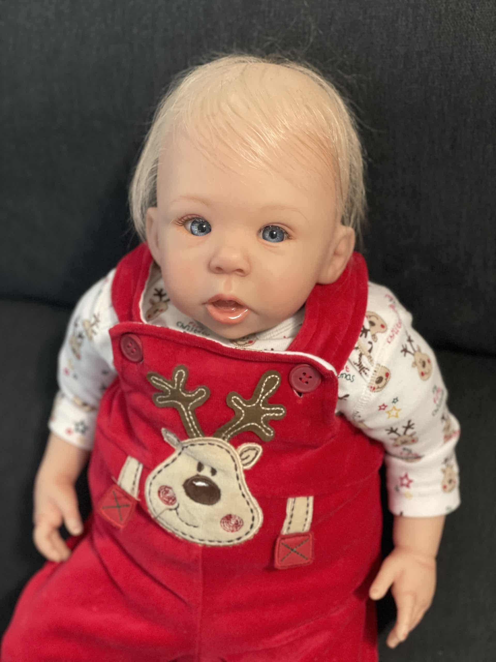 Josiah Reborn in Toy Style or My First Reborn style. No mottling. Blushed and Shaded with blue acrylic eyes and Rooted White blonde Hair. He is 17 inches. 3/4 arm and full leg. Signed with COA. Wears preemie or small newborn.