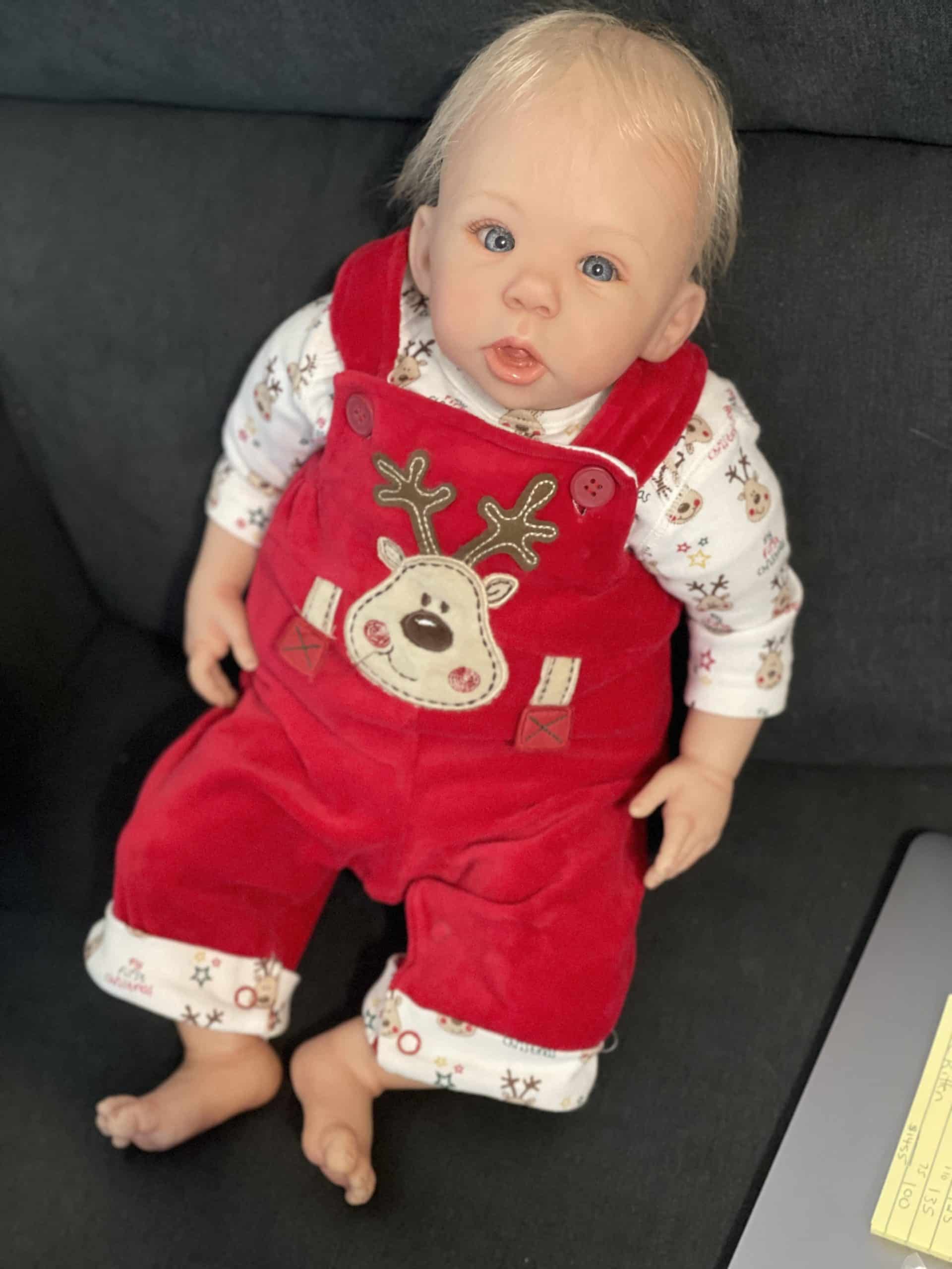 Laura is an early Reborn. She is blushed only. Blonde rooted hair and blue eyes. 3/4 arm and full legs. Comes in Christmas outfit.